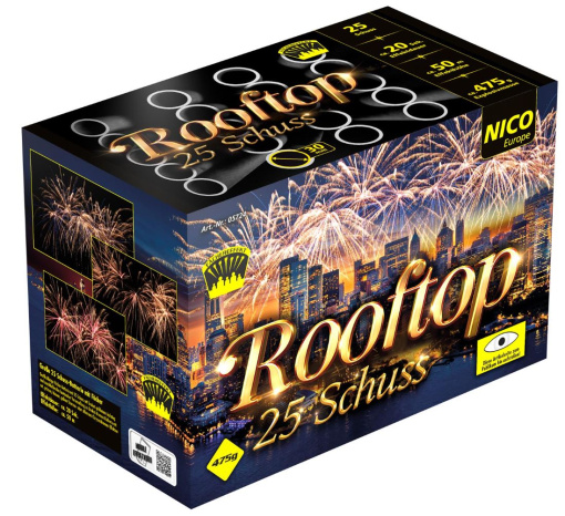 Heben Sie die nächste Silvester-Feier auf das nächste Level – mit der spektakulären ROOFTOP Fächerbatterie!Diese elegante Batterie entfaltet sich in einem goldenen Brokat-Aufstieg, der den Himmel zum Funkeln bringt, bevor die wahre Magie beginnt.Mit jedem Schuss verwandelt sich der Nachthimmel in ein Meer, bestehend aus leuchtenden Brokat-Kronen, die in einer atemberaubenden Fächerform geschossen werden.Farbexplosionen in strahlendem Rot, Grün, Blau und Gelb sorgen für ein Feuerwerk der Extraklasse, während silberne Chrysanthemen-Effekte die gesamte Szenerie verzaubern.Aber das ist noch nicht alles – mit einer beeindruckenden Effekthöhe von bis zu 50 Metern und einer Action-geladenen Dauer von 20 Sekunden wird jeder in den Bann dieses fantastischen Feuerwerks gezogen.