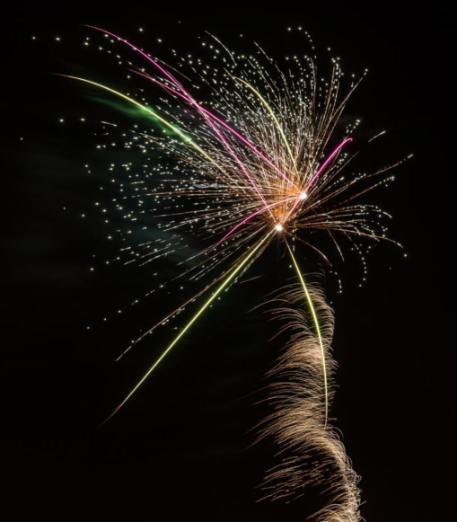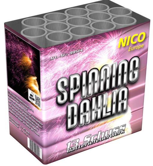 13-Schuss-Bombettenbatterie, nacheinander zündend, silberner Wirbelaufstieg mit anschließender Zerlegung zu großen zitronengelben und purpurfarbenen Dahlien-Sternen umrahmt von weißem Glitzerregen, endend mit einer 3er-Salve als Finale.