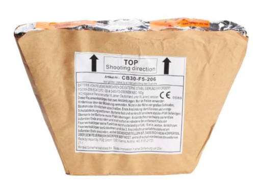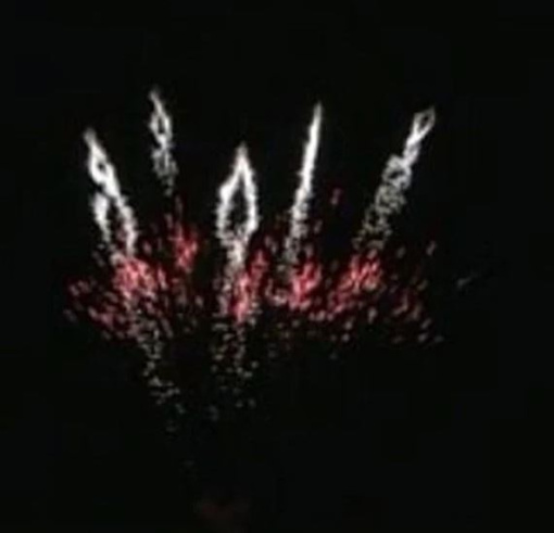 Red glitter mine to silver Farfalle 5 Schuss One Row Fan 5 rot glitzernde Feuertöpfe silbernen Farfalle-Wirbeln werden auf einmal als Fächer abgeschossen. Gegenstand muss vor Zündung gegen Umfallen gesichert werden!!!