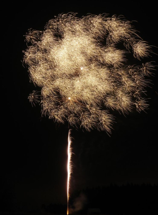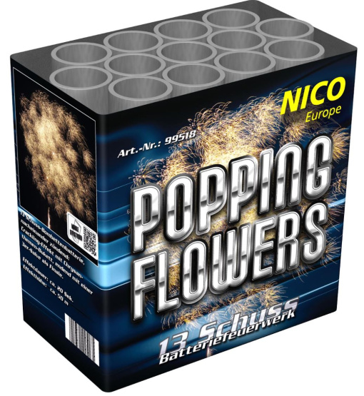 13-Schuss-Bombettenbatterie, nacheinander zündend, mit silberner Leuchtspur aufsteigend und anschließender lautstarker Zerlegung in große Popping-Effekte mit Crackling, endend in einer 3er Salve als Finale.