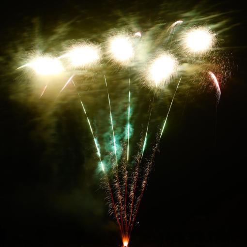 Phase 1: Grün glitzernde Feuertöpfe mit goldenen oder roten Blinkkometen, gefolgt von knisternden Chrysanthemen- Salven.Phase 2: Crackling-Aufstieg goldener Palmen mit Silberspitzen, gefolgt von Dragon- Egg-Effekten mit grün oder rot fallenden "Leaves-Effekten" und anschließenden, gegabelten Feuertöpfen mit Popping-Chrysanthemen.Phase 3: Grün oder rot aufsteigende Leuchtsterne mit anschließender Verwandlung zu Silberchrysanthemen mit lang ziehenden Kometen, gefolgt von mächtigen Crackling-Fächern.Phase 4: Rasanter Abschluss aus 24 "Chaos-Kometen", endend in 2 Salven mit lang ziehenden Knattersternen mit roten Blinkern.