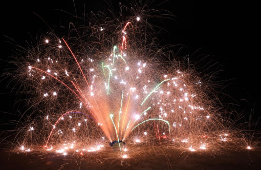 Gefächerte Premium Fontänenbatterie VeneziaBild 1: Zum Beginn eine silberne Prachtfontäne.Bild 2: 2 stark gefächerte Silberweiden mit roten Blinksternen.Bild 3: 3 gefächerte, goldene Weiden-Fontänen mit zitrongelben und blauen Sternen.Bild 4: 3 gefächerte, silberne Schweiffontänen mit anschließender Verwandlung zu Silber- chrysanthemen mit roten und grünen Prachtsternen.