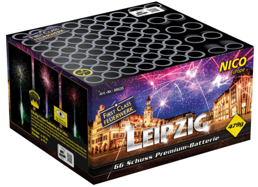 Leipzig – Eine Hommage an Eleganz und Feuerwerkskunst! Willkommen in der strahlenden Welt von Leipzig, unserer neuesten 66-Schuss Premium-Batterie aus der NICO First Class Serie. Inspiriert von der Vielfalt und dem Glanz dieser geschichtsträchtigen Stadt, wird jeder Moment ein Erlebnis der Extraklasse:Eleganter Auftakt: Grüne und lila Feuertöpfe steigen hoch in die Nacht und verwandeln sich in faszinierende Buketts mit goldenem, grünem oder rotem Glitzer – ein Feuerwerk wie ein funkelnder Tanz.Farben, die begeistern: Grüne Feuertöpfe mit weißen Blinksternen leiten über zu himmlischen blauen Stern-Buketts, die in lebhaftem Grün und Weiß aufblitzen – wie ein Festival am Nachthimmel.Finale mit Wow-Effekt: Zwei prächtige Salven erleuchten den Himmel mit bunten Blinksternen und Chrysanthemen-Fächern – ein Abschluss, der Applaus verdient!