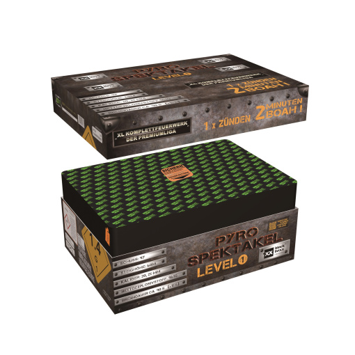 XL Verbundfeuerwerk der Premiumklasse, bestehend aus 9 verschiedenen Batterien mit insgesamt 13 verschiedenen Effektkombinationen in folgender Performance: 1. Rote Schweifchrysanthemen abwechselnd mit Goldflimmersternen und Cracklingblüten kombiniert und mit rotem Kometenschweif aufsteigend. 2. Große, füllige Goldweidenbuketts. 3.+4. Gold-Blaue Kometen, im Zickzack-Fächer geschossen, verwandeln zu Brokatkronen mit blauen Spitzen und rotem Blütenregen mit blauen Sternen. 5. Große Dahlienbuketts mit kräftigen Trend-Farben in Rot, Purpur und Gelb, immer kombiniert mit fülligem Silberblinker. 6. Goldflimmerschweifkometen verwandeln zu großen Buketts aus Goldflimmerkronen. 7.+8. Im Zickzack geschossene Feuertöpfe aus Silberflimmer in Kombination mit Goldschweifkometen werden getoppt von einer Kombination aus Brokat-Cracklingblüten und Titangold-Weiden. 9. Den Abschluss bildet ein gigantischer Feuertopf-Fächer aus Cracklingblüten und Brokatschweifkometen mit darüber aufgehenden, roten Funkenblüten in großen Buketts aus Brokat-Cracklingblüten.