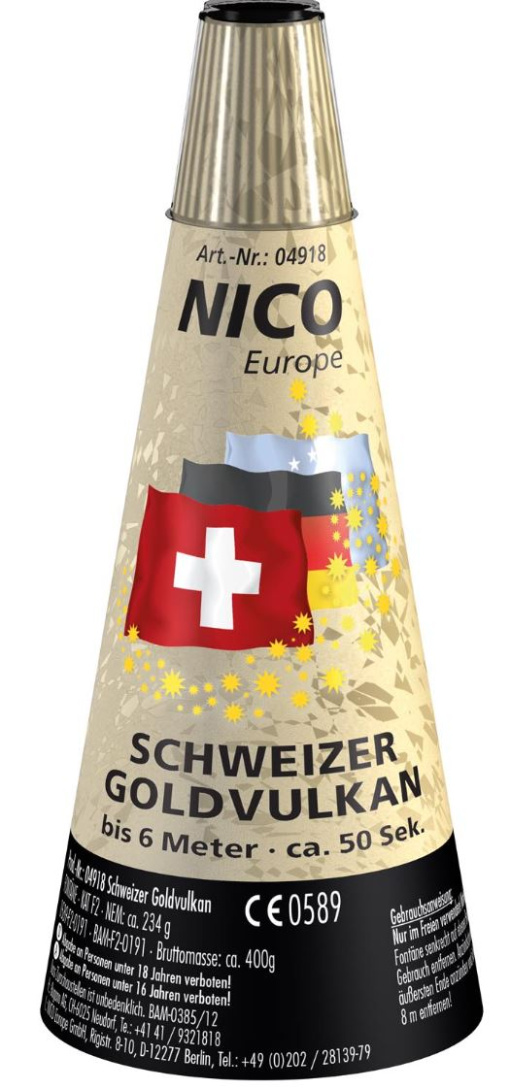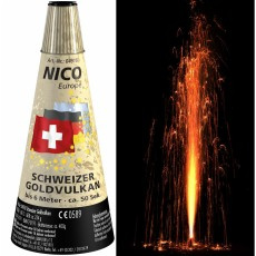 Der SCHWEIZER GOLDVULKAN sorgt für den Glanz und die Magie eines wahren Feuerwerks! Seine goldenen Funken und Sterne erheben sich bis zu 6 Metern in die Luft und versprühen ein einzigartiges Farbspiel. Ein unvergessliches Erlebnis!