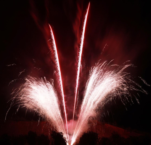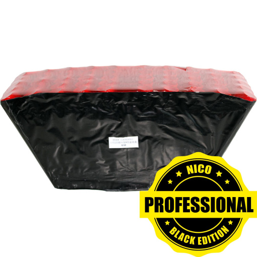 50 Schuss Fächerbatterie mit 5 Schmetterlings-Effektbildern nacheinander, mit goldflimmernden Flügeln, blauen Spitzen sowie zwei roten Leuchtsternen und silberner Leuchtspur als Fühler.