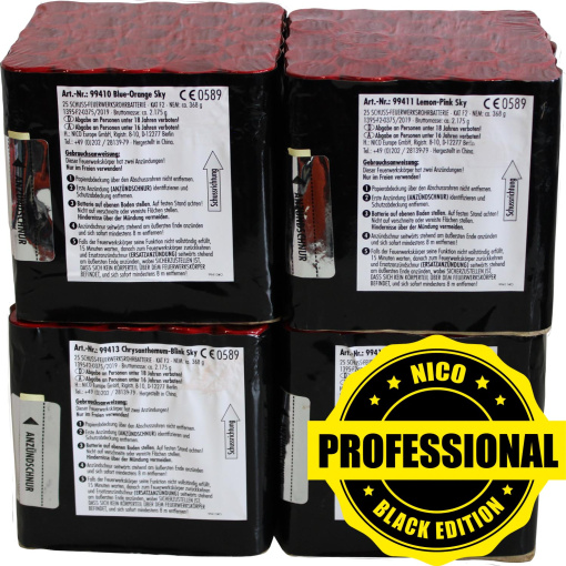 Profi Mix mit je 25 Schuss keine Auswahl möglich Stückpreis!Jeweils nach 5 Schuss wechselnde zweifarbige Effektbilder, bestehend aus Feuertöpfen und Stern-Bukettes, mit einer 5er-Salve zum Abschluss:99410 Blue-Orange Sky99411 Lemon-Pink Sky99413 Chrysanthemum-Blink Sky99414 Multicolour-Blink Sky