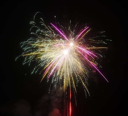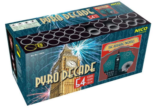 Langlaufende großkalibrige 54 Schuss Batterie, vielfältige Effekte, geschossen in Gabeln, Fächern und Salven mit bunten Sternbuketts, rauschenden Verwandlungssternen, Titan-Lanzen und großen Dahlien Sternen, endend in einem Finale mit zwei breiten Salven mit lang ziehenden silbernen Time-Tree Effekten. Verkaufsbeschränkung F3