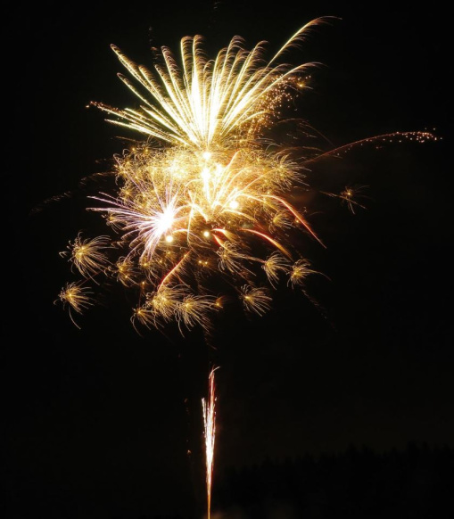 Vielseitige 36 Schuss-Batterie, in schneller Abfolge mit roter, grüner, gelber oder blauer Leuchtspur aufsteigende Bombetten mit anschließender lautstarker Verwandlung zu goldenen Brokatkronen, grünen/ blauen/ roten Sternenwolken oder glitzernden langziehenden Weiden-Buketts.