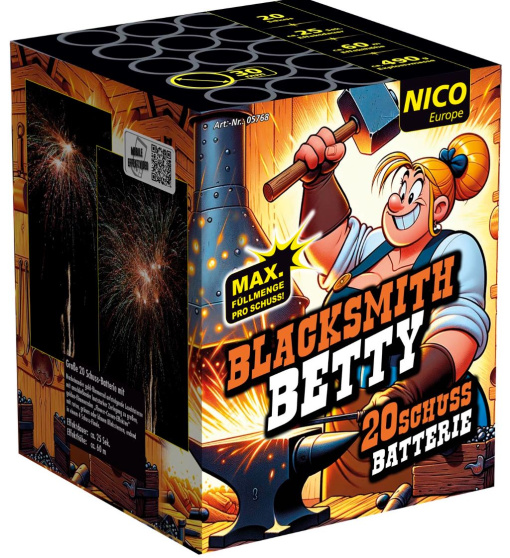 Howdy, „Blacksmith Betty“ ist in der Stadt und lässt ordentlich die Funken fliegen!Die kraftvolle 20-Schuss-Batterie (490 NEM) mit aufsteigenden, gold-flimmernden Leuchtsternen mit anschließender lautstarker Zerlegung zu großen, golden flimmernden "Flower-Crown-Effekten" mit roten, grünen oder blauen Blinksternen bringt die Prärie ordentlich zum Beben. Und für den Showdown? Ein 4-Schuss-Finale, das jeden Cowboy und jede Cowgirl zum Staunen bringt.