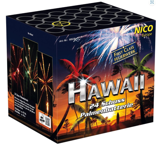 24 Schuss Palmenbatterie, mit breitem, farbigem Glitzerschweif aufsteigende Lanzen mit anschließender lautstarker Verwandlung zu lang stehenden rot, grün oder gelb glitzernden Palmen-Effekten. Wir stellen vor Hawaii – die tropische 24-Schuss Palmenbatterie. Nicht nur die Verpackung erinnert an einen Urlaub im Warmen, sondern auch die Effekte erinnern an den Inselstaat im Pazifik. Die Batterie erzeugt aufsteigende Lanzen mit farbigem Glitzerschweif. Anschließend folgen lautstarke Verwandlungen zu langen, stehenden rot, grün und gelb glitzernden Palmen-Effekten. Hawaii verspricht einen Wow-Moment- da möchten wir doch direkt in den Urlaub fliegen, oder?