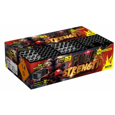 Ring frei für "Full Strength" – dem neuen Feuerwerkwerk-Schwergewicht!Sind Sie bereit für explosive Kombinationen? Der Mehrfachverbund bringt mit 3 Batterien und 200 Schüssen die volle Power eines Boxkampfes in den Nachthimmel.Phase 1: Wie ein kräftiger linker Haken startet es mit roten Palmen-Effekten, umrahmt von weißem Glitzer. Dann kommt der Doppel-Uppercut: Zwei dreifach gegliederte Effekt-Fächer mit bunten Glitzerbuketts und roten Crackling-Wolken!Phase 2: Wie ein schneller Kombinationsschlag folgen blaue und rote Glitzer-Buketts, die in Fächer mit bunten Palmen und Knattersternen übergehen. Jeder Schuss trifft wie ein gezielter Boxschlag!Phase 3: Und für das Knockout-Finale – Brokat-Kronen-Effekte, die in ein spektakuläres Finale mit bunten, gefächerten Palmen-Buketts münden, umrahmt von Chrysanthemen-Blüten, so beeindruckend wie der Siegesschlag eines Champions.