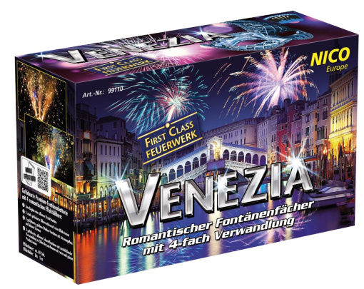 Gefächerte Premium Fontänenbatterie VeneziaBild 1: Zum Beginn eine silberne Prachtfontäne.Bild 2: 2 stark gefächerte Silberweiden mit roten Blinksternen.Bild 3: 3 gefächerte, goldene Weiden-Fontänen mit zitrongelben und blauen Sternen.Bild 4: 3 gefächerte, silberne Schweiffontänen mit anschließender Verwandlung zu Silber- chrysanthemen mit roten und grünen Prachtsternen.