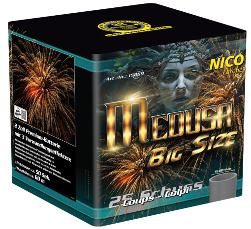 Verkaufsbeschränkung F3 oder für Österreich / Schweiz erhältlich! 2 Zoll Premium-Batterie mit 3 Verwandlungseffekten: Mit breitem Goldschweif aufsteigend und anschließender lautstarker Zerlegung zu Godbrokat-Buketts mit roten oder grünen Verwandlungsspitzen oder zu roten Blinkstern-Buketts mit fliegenden silbernen Medusen-Sternen.Schutzabstand 25m