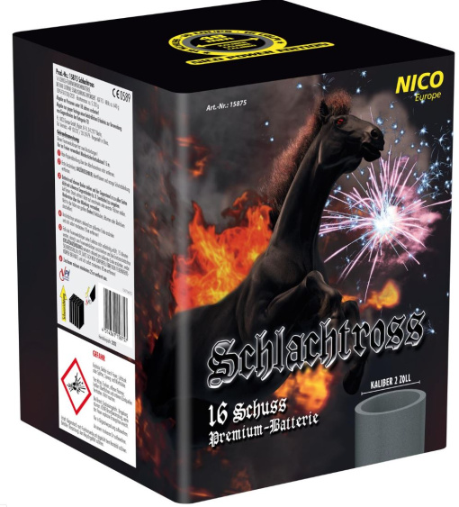 Verkaufsbeschränkung F3 oder für Österreich / Schweiz erhältlich! 2 Zoll Premium-Leuchtbatterie mit 4 abwechselnden Hammer-Effekten: Silberner Glitzeraufstieg und heftige Zerlegung zu Brokatkronen oder lang ziehenden Titan-Goldweiden, Silberlanzen mit bunten Blinksternen und einem 4 Schuss-Finale "Popping-Flower-Effekten".