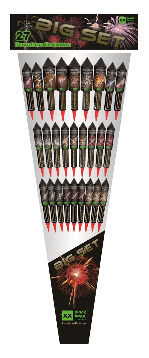 27 hochwertige Premium-Raketen vom Kaliber 24, 27, 32 und 42 mm im Sortimentsbeutel. Inhalt: 3x Pictor - Goldflimmerwolke mit rotem Sternbukett; 3x Corvus - Goldflimmerwolke mit grünem Sternbukett; 3x Scorpius - Goldflimmerwolke mit gelbem Sternbukett; 3x Cepheus - gelbe Coco-Palme; 3x Apus - Silberpalme mit roten Blinksternen; 3x Lynx - rote Coco-Palme mit weißen Blinksternen; 1x Lepus - Silberflimmerwolke mit Sternenbukett in Pink; 1x Fornax - Brokatkrone mit blauen und roten Spitzen; 1x Lupus - rote Coco-Palme mit Crackling Flowers; 1x Centaurus - Goldchrysantheme mit blauen Sternen; 1x Taurus - Brokatkrone mit Verwandlung zu Cracklingblüten; 1x Aries - Brokatkrone; 1x Libra - Titangold-weide mit blauem Sternbukett, 1x Sculptor - Goldflimmerchrysantheme; 1x Vela- Brokatkrone mit Goldflimmer